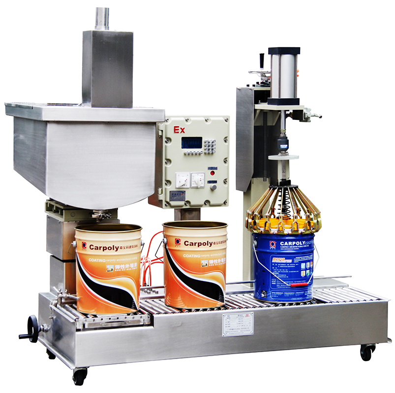 1. Suitable for filling tins, canisters and pails of 1 to 30 liters below 100kg, powered roller conveyor; filling of open round plastic barrels within 50kg, small round cans and small square cans can also be adapted.